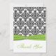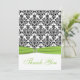Ce carte de remerciements noir et blanc de damassé avec le vert de chaux A IMPRIMÉ SUR le ruban et jewels des matchs de broche le faire-part de mariage montré ci-dessous. Il y a également un carte de remerciements de style de carte de voeux, si vous préférez cela. Le texte et le type de papier est tout personnalisable. Si vous avez besoin de n'importe quels autres articles assortis, envoyez svp votre demande à niteowlstudio@gmail.com.