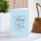 This stylish baby shower thank you card features a sweet light blue background, elegant dark grey calligraphy script, and typography. Simply edit the template with your details and choose paper options. Coordinating items are available in our store or the design collection.