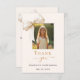 Un carte de remerciements de confirmation moderne et élégant pour une fille. Arrière - plan de couleur crème douce, décoré d'un grand arc. Lettres noires et dorées. Sur le devant le texte : Merci, photo, nom, et une date. Retour : Modèle pour Votre mot de remerciement et nom.