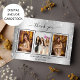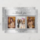 Ajoutez 3 de vos photos d'anniversaire, la taille verticale, une date, un nom et la note de remerciement. Un faux arrière - plan argenté et une fausse parties scintillant, brille. Texte et cadre noirs. Le texte : Merci sur l'avant et votre nom sur l'arrière sont écrits avec une écriture manuscrite stylisée.