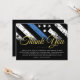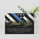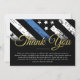 Cette conception comprend un drapeau de la police avec des rayures noires et blanches, ainsi qu'une mince bande bleue. Cette carte est idéale pour envoyer un message de remerciement à tous les invités qui ont assisté à la retraite de l'agent de l'application de la loi, shérif, capitaine, ou chef du parti de retraite.