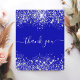 Couleur arrière - plan bleue royale. Décoré avec de la poussière de parties scintillant en faux argent. Sur l'avant grand blanc écriture et le texte : Merci. Retour : Personnalisez et ajoutez Votre note de remerciement et votre nom. Le Merci est écrit avec un script de style manuel moderne avec des swashes. Pour que les swashes ne suppriment que le nom de l'échantillon, laissez les espaces ou émoticônes devant et après le nom.