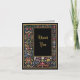 Un Carte de remerciements modifiable avec art gothique vintage d'un manuscrit éclairé antique, fleurs colorées et feuilles défilant sur un arrière - plan noir sur le devant et éléments manuscrits à l'intérieur.