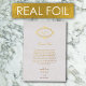 Un beau mariage en feuille d'or véritable avec des initiales monogrammées dans une couronne élégante traditionnelle. Un superbe design mariage blanc et or avec une typographie minimaliste classe. La typographie de script traditionnelle et la couronne damasée créent un design élégant intemporel de feuille d'or mariage carte de remerciements.