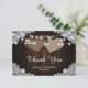 Merci à votre invité de partager votre journée spéciale avec ces romantiques mariages rustiques violets et bleus, merci les cartes de remerciement avec des coeurs de burlap sur un arrière - plan en bois de grange décoré de dentelle fleurie blanche et de lampes à cordes. Des fleurs d'hydrangée violette et bleue à l'arrière. Éléments correspondants disponibles.