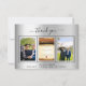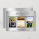 Ajoutez 3 de vos photos, la taille verticale, une date, un nom et la note de remerciement. Un arrière - plan faux argenté avec du texte et du cadre noirs. Le texte : Merci sur l'avant et votre nom sur l'arrière sont écrits avec une écriture manuscrite stylisée avec des swashes.
