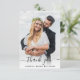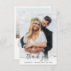 Carte de remerciements de mariage élégante avec votre photo de jour de mariage superposée avec "merci" dans un script chic avec des swashes, et vos prénoms et date de mariage unis avec un coeur. Au contraire, ajoutez une photo supplémentaire, personnalisez votre message de remerciement et ajoutez vos noms dans un script signature.