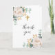 Fond blanc. Floraux blancs, pivoines et végétation d'eucalyptus. Merci est écrit avec une grande police de style lettrée à la main. A l'intérieur : Une grande photo à l'intérieur et un espace pour écrire à la main. Retour : 2ème photo.