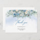 Carte de remerciement de mariage avec hydrangea bleu boho et roses blanches eucalyptus