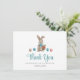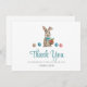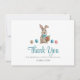 Une carte de remerciement de lapin de Pâques bleue avec un thème de jardin ou de printemps. Un moyen parfait de remercier vos invités d'être venus à votre fête.