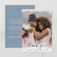 Elégante carte de remerciements bleu mariage poussiéreux avec "merci" dans un script élégant avec des écharpes superposant votre photo de jour de mariage et vos prénoms et date mariage unis avec un coeur. Sur le dos, personnalisez votre message de remerciement dans une simple typographie blanche et ajoutez vos noms dans un script blanc signature.