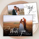 Élégant Moderne Chic Boho Calligraphie Script Mariage 2 Carte de remerciements photo. Un mariage élégant vous remercie modèle avec une photo verticale complète sur le devant avec le texte "Merci" dans une main tourbillonnant fantaisie lettrage typographie script swash tail police blanc overlay sur l'image et un côté inverse (1) photo et message de remerciement pré-fait. Carte recto verso avec 2 photos. Personnalisez facilement vos détails et votre message. Si vous préférez écrire votre note à la main, supprimez simplement l'exemple de texte pour gagner de l'espace. Si vous avez besoin d'aide ou de l'article correspondant, s'il vous plaît contactez-moi!