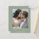 Budget Sage Vert Mariage Merci Cartes qui ont une photo sur le devant et le dos. Les cartes de remerciement contiennent une typographie de script moderne, lettrée à la main, qui sont élégantes, simples et modernes à utiliser après la célébration du mariage.