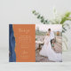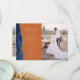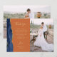 Envoyez à votre famille et à vos amis un mariage spécial merci avec ces cartes photos personnalisés. Sur la gauche, les mots "merci" apparaissent dans une élégante typographie manuscrite couleur or sur un arrière - plan orange brûlé ou rouille sur un bref message de remerciement, modifiable, à vos invités mariages en cuivre, avec vos noms ci-dessous. Une bordure en aquarelle bleu marine découpée avec une parties scintillant en faux or décore le bord gauche. L'envers offre de l'espace pour une seconde photo horizontale.