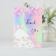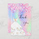Un carte de remerciements d'anniversaire féminin et élégant. Une couleur arrière - plan holographique en rose, violet et vert menthe. Avec confetti rose et robe blanche. Sur l'avant grand main écriture et le texte : Merci. Retour : Personnalisez et ajoutez Votre note de remerciement et votre nom. Le nom est écrit avec un script de style moderne écrit à la main.