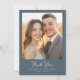 This wedding thank you card features a warm, romantic design with a central photograph of a couple bathed in soft sunlight, creating an intimate and serene atmosphere. The deep navy blue border frames the image beautifully, contrasting with the warm hues of yellow and orange in the background. Elegant cursive script for "Thank You" is paired with structured serif fonts for a sophisticated touch, enhancing the overall mood of gratitude and celebration. Perfect for expressing heartfelt thanks after a special day, this card combines photographic realism with clean typography to convey your emotions effectively.