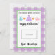 Cette carte d'Halloween pour professeur présente un arrière - plan plaid violet et blanc avec des accents verts et dit "Pas de tours juste un régal. Joyeux Halloween !" et un mignon petit trio de costumes. Il y a aussi un espace pour laisser une carte cadeau. Personnalisez avec le nom de votre enfant.