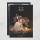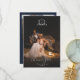 Vins intemporels Monogram Crest Photo Overlay, 2 photo mariage carte de remerciements. Caractéristiques, lignes de texte modèles pour vos noms et message personnalisé sur l'arrière - plan bleu marine.