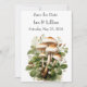 Le mélange parfait de rustique et de bohème. Champignon aquarelle et police simple pour votre carte de save-the-date.