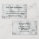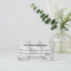 Cette carte de rendez-vous professionnel est recto verso. Les deux côtés ont un élégant arrière - plan en marbre blanc faux. La première partie indique "Votre prochaine nomination" et comporte des lignes pour la date et l'heure du rendez-vous. En bas, il y a le texte d'affichage que vous pouvez modifier pour créer un message personnalisé si vous le souhaitez. (Affichage : Veuillez fournir un préavis de 24 heures si vous ne pouvez pas garder votre rendez-vous.) La deuxième partie contient du texte d'affichage à remplacer par le nom de l'entreprise et son adresse, son numéro de téléphone et son site Web. Tout le texte peut être modifié ou supprimé. Le texte est noir.