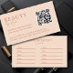Moderne, simple, salon, carte de rendez-vous QR-Code, Pêche. Modifiez votre produit en quelques minutes en ajoutant vos données. Gardez l'aspect poli et professionnel de votre entreprise avec cette carte de rendez-vous élégante et minimaliste. Conçue en orange et pêche intemporelle, cette carte recto verso présente une disposition propre pour la planification des rendez-vous d'un côté et les détails de votre entreprise de l'autre — y compris un code QR personnalisable qui donne directement accès à votre page de réservation, à votre site Web ou aux médias sociaux. Parfait pour les salons, les spas, les studios de beauté, les massothérapeutes, les prestataires de bien-être, les esthéticiens, les barbiers, les techs à ongles, etc. Éditez rapidement avec vos propres coordonnées, adresse et nom de marque — prêt à être utilisé en quelques minutes ! Mise en page professionnelle pour jusqu'à 5 rendez-vous Code QR facilite et modernise la reréservation Entièrement modifiable - personnalisez vos informations en quelques minutes Idéal pour toutes les entreprises de services Aussi grand dans le cadre d'un package de bienvenue ou un cadeau client