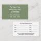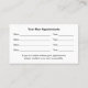 Cette carte de rendez-vous professionnelle moderne est facile à personnaliser en ligne avant de commander. L'avant de la carte présente du texte blanc sur une couleur arrière - plan de vert sage. Si vous avez besoin de changer le vert sauge en couleur de votre entreprise/marque, faites défiler le modèle de personnalisation et cliquez sur "Modifier en utilisant l'outil de design" et ajustez en conséquence avant de commander. Le verso de la carte de rendez-vous comporte du texte noir avec des lignes noires, disposées dans un agencement soigné, avec des espaces pour les dates et les heures de rendez-vous à écrire à la main lorsque la carte est utilisée.