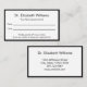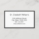La carte de rendez-vous de ce médecin professionnel est recto verso. Les deux côtés ont une élégante bordure noire. Le premier côté contient une ligne de texte d'affichage pour le nom du médecin ou du médecin. La deuxième ligne du texte d'affichage indique "Votre prochain rendez-vous". La deuxième partie comporte également des lignes pour la date et l'heure du rendez-vous. En bas, il y a le texte d'affichage que vous pouvez modifier pour créer un message personnalisé si vous le souhaitez. (Affichage : Veuillez fournir un préavis de 24 heures si vous ne pouvez pas garder votre rendez-vous.) La deuxième partie a un texte d'affichage à remplacer par le nom du médecin (ou le nom de l'exercice) et son adresse, son numéro de téléphone et son site Web. Tout le texte peut être modifié ou supprimé. Le texte est noir.