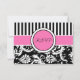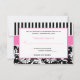 Cette carte de réponse moderne à rayures roses, noires et blanches avec un damas floral correspond à l'invitation de mariage présentée ci-dessous. Le texte et le type de papier sont personnalisables. ****VEUILLEZ vous assurer que tout le texte est centré et dimensionné exactement comme vous le souhaitez, car il sera imprimé exactement comme vous le voyez sur votre écran. Je ne le verrai pas, et Zazzle ne modifiera rien, donc si vous avez besoin d'aide, veuillez m'envoyer un courriel AVANT de passer votre commande. Si vous avez besoin d'articles assortis, veuillez envoyer votre demande à niteowlstudio@gmail.com.