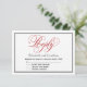 Sophistiqué et élégant, ce carton de réponse RSVP de mariage à l'écriture rouge, noire et blanche est coordonné avec notre suite de mariage Rouge et Blanc Foi Espérance et Amour de faire-part de mariage chrétiens contemporains et accessoires. Il peut également être utilisé avec d'autres modèles de mariage qui utilisent les mêmes couleurs. Conçu par Natalie Schorr pour Graphic Suite sur Zazzle.