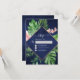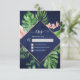 Cartes de réponse de mariage de printemps ou d'été avec feuilles de palmier vert tropical et fleurs rose blush à l'aquarelle avec faux or rose géométrique et fond bleu marine - comprend une belle et élégante typographie script avec des fleurs botaniques tropicales modernes et de la verdure pour la célébration spéciale du jour du mariage.