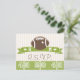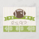AJOUTEZ LES INITIALES DE LA MARIÉE ET DU MARIÉ À CES CARTES POSTALES DE RÉPONSE DE MARIAGE, DE FÊTE DE COUPLE OU DE FUTURS MARIÉS, DE FÊTE D'ANNIVERSAIRE DE MARIAGE OU DE DINER DE FIANÇAILLES SUR LE THÈME DU FOOTBALL. UN FOOTBALL AVEC UN CŒUR DESSUS SUR UN FOND À RAYURES CRÈME ET BLANC. AJOUTEZ LE MONOGRAMME DE LA MARIÉE ET DU MARIÉ SUR LA BANNière VERT IMPRIMÉ DE TYPE RUBAN FLANQUÉE DE CŒURS BLANCS AU-DESSUS D'UN TERRAIN DE FOOTBALL 50 YARD. RSVP EN MARRON FOOTBALL. ŒUVRE © CHRISSY H. STUDIOS, LLC. TOUS DRO
