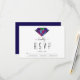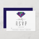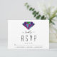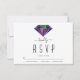 Carte de réponse de mariage en typographie moderne avec des tons de joyaux de diamant géométrique abstrait. Cette conception de mariage affiche un diamant dans des tons de joyaux : bleu marine, violet pourpre, rouge rubis, bleu turquoise et vert émeraude avec un contour en feuille de métal doré FAUX.