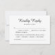 Nous sommes ravis de vous présenter notre carte de réponse de mariage moderne et élégante. Conçue pour compléter parfaitement votre thème de mariage contemporain, cette carte est un véritable mélange d'élégance et de simplicité. La phrase "Répondre s'il vous plaît" est délicatement écrite dans une police de caractères script gracieuse et ajoute une touche de sophistication à votre suite d'invitation, demandant gracieusement à vos invités de répondre à votre grand jour. La carte de réponse comprend également une section pour les options de menu que les invités peuvent choisir. Ces informations vous aideront à créer un menu de mariage que tout le monde appréciera. Notre design minimaliste convient non seulement aux mariages, mais peut également être personnalisé pour d'autres événements spéciaux. Qu'il s'agisse d'une célébration intime d'anniversaire ou d'une soirée cocktail sophistiquée, nos cartes de réponse ajouteront cette touche supplémentaire d'élégance à n'importe quelle occasion. Command
