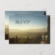 Carte de réponse moderne avec deux verres et raisins sur un tonneau de vin, avec une vue sur un beau paysage. Vous pouvez personnaliser tous les textes. Cette carte de réponse correspond aux invitations.
