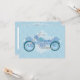 Une moto aux nuances de bleu et de violet avec des courbes et des tourbillons doux se dresse contre un treillis blanc sur un fond floral bleu remplissant cette carte de réponse d'invitation de mariage de biker avec de la romance. De mon image originale créée numériquement.