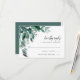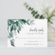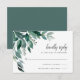 Élégante carte de réponse botanique avec des feuilles d'eucalyptus et du feuillage en aquarelle verte, calligraphie encre noir mat et lettrage en bloc. Personnalisez avec la date de réponse RSVP souhaitée ainsi que les termes d'acceptation et de refus personnalisés. Conçue pour correspondre à notre collection d'invitations Feuillage Abondant.