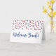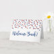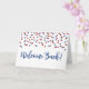 Carte de retour de bienvenue avec motif de confettis rouge et bleu. Parfait pour accueillir les employés au travail.