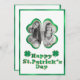 Cette carte de vœux personnalisée de Saint-Patrick présente un cadre photo de trèfle chanceux. Le cadre présente un design à paillettes dorées et à feuille verte. Un exemple de photo est placé à l'intérieur, que vous pouvez personnaliser pour inclure votre propre photo ou autre image. Le vœu Joyeuse Saint-Patrick est imprimé dans une police bulles assortie verte et or. Deux trèfles sont placés de chaque côté.