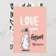 Cette carte de Saint-Valentin présente une illustration de lapin mignon associée à un script personnalisé "je t'aime pour toujours" et votre monogramme personnalisé ci-dessous dans une police décorative. Le verso présente un fond blanc avec des cœurs artistiques dans un motif transparent bicolore.