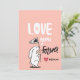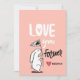 Cette carte de Saint-Valentin présente une illustration de lapin mignon associée à un script personnalisé "je t'aime pour toujours" et votre monogramme personnalisé ci-dessous dans une police décorative. Le verso présente un fond blanc avec des cœurs artistiques dans un motif transparent bicolore.
