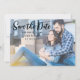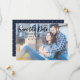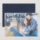 Carte de sauvegarde de date horizontale. Ce design a un look et une sensation décontractés. Au dos, il y a un fond bleu foncé avec des points de couleur or.