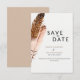 Une simple carte de sauvegarde de date avec une image d'illustration de plume, compatible pour un mariage en plein air (jardin) ou moderne à l'intérieur ou une fête de fiançailles.