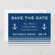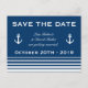 Carte de sauvegarde de date de mariage | Thème nautique. Conception avec des bandes bleues et blanches et des ancres de marine. Idéal pour rappeler à vos invités vos mariages maritimes ou de plage. Noms de mariés personnalisables avec un texte élégant.