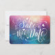 Jolie aquarelle de nébuleuse colorée, rose, bleue et violette avec un texte 'Save the Date' blanc contrastant.