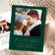 Cette simple carte postale de sauvegarde de date minimaliste comporte une photo carrée au-dessus des mots "Sauvegarder la date" dans un script manuscrit doré élégant, suivi des noms des mariés, de la date du mariage et de la ville dans une police sans serif sur un fond vert émeraude. Ajoutez une deuxième photo horizontale et un message plus détaillé avec des informations supplémentaires au verso, ainsi que votre adresse de retour.