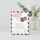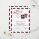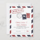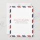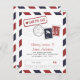 Carte de sauvegarde de date inspirée de l'aviation en rouge et bleu. Timbre faux et marques de poste pour un mariage sur le thème du voyage.