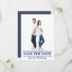 Voici un design amusant pour le couple qui aime la voile ou le bateau. Sous la photo, sur le devant, il y a "SAUVEGARDEZ LA DATE" "pour notre mariage". Au dos, il y a une bordure bleue avec des vagues dorées. En haut du design, il y a une ancre bleue que vous pouvez supprimer ou remplacer. Ce design est présenté avec un QR (que vous pouvez créer) qui peut être lié et scanné pour accéder à un site web avec des informations sur le mariage.