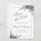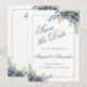 La conception présente un bouquet d'hortensias violets avec un bouquet de feuillage d'eucalyptus avec une bordure grise claire. Cela va avec notre collection de faire-part de mariage assortis.