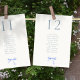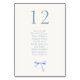 Cette jolie carte blanche à table dispose d'un joli ruban bleu aquarelle et d'une police bleue poussiéreuse. Le design comprend 10 personnes par table, mais le design peut accueillir jusqu'à 12 personnes maximum. La conception est répétée à l'arrière pour une visibilité facile de tous les côtés de la table. Ajoutez chaque panneau avec un numéro de siège individuel au panier.