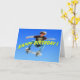 Une carte d'anniversaire personnalisable montrant un skate en mouvement rapide en action avec les mots HAPPY BANTHDAY en jaune vif et bleu écriture contre un arrière - plan bleu ciel. Ajoutez votre propre message dans la carte dans une police de votre choix.